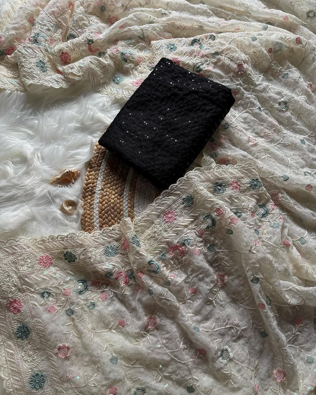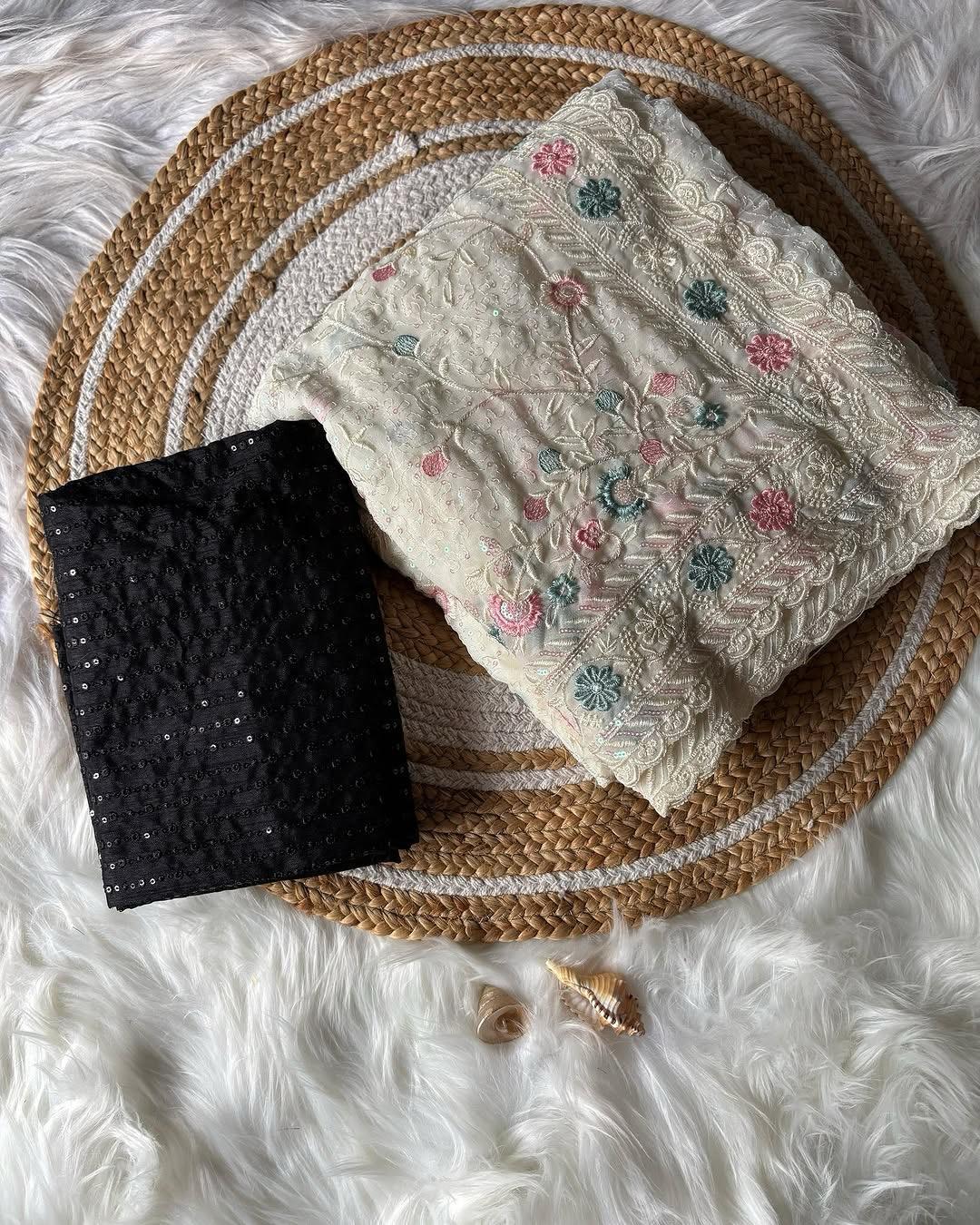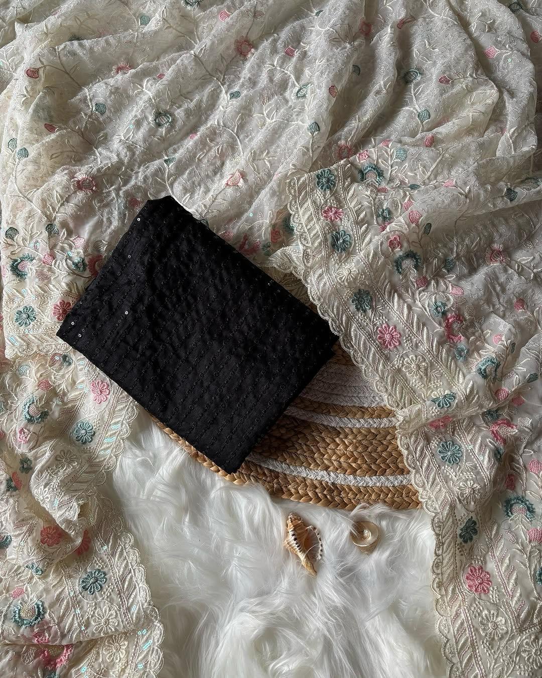 Step into effortless grace with our Aafreen Pastel Garden Chikankari Saree, a delicate fusion of tradition and femininity. Hand-embroidered with intricate chikankari floral motifs in soft pastel tones, this ivory-hued saree is crafted on lightweight georgette with hints of sequin work for a subtle shimmer. A contrast black sequin blouse piece adds a bold touch, creating the perfect balance of elegance and edge.