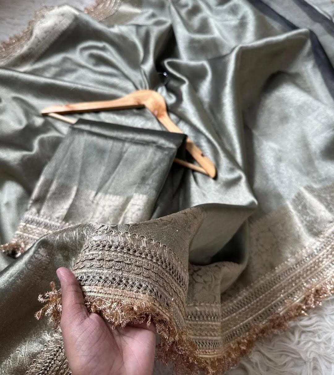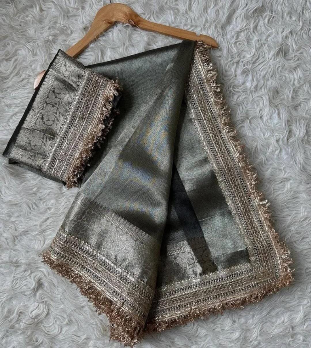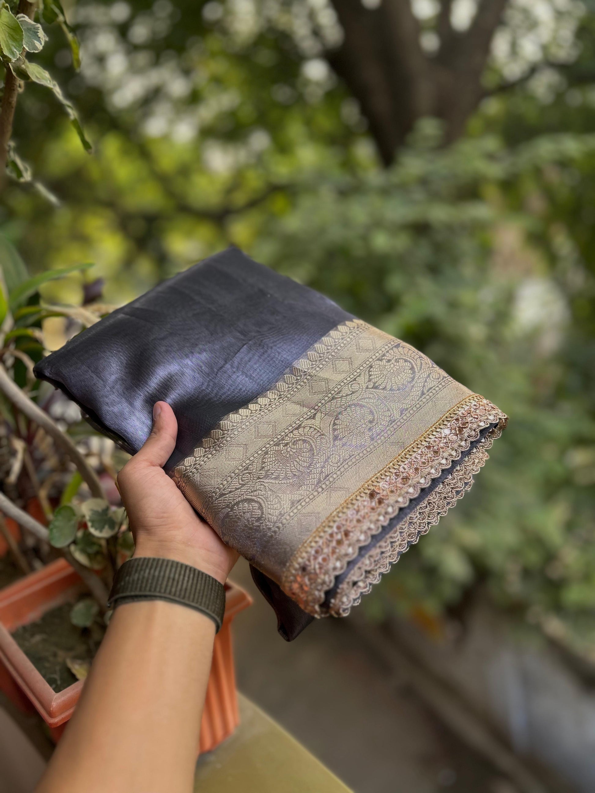 Classic, graceful, and elegant – this black Banarasi Tissue Silk Saree from our Riwayat Collection is the perfect choice for women who love luxury looks at a budget-friendly price. Featuring all-over buti weaving, a delicate lace border, and a matching blouse piece, this saree is designed for festivals, puja rituals, family gatherings, and evening parties.