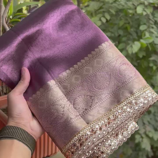 Classic, graceful, and elegant – this violet Banarasi Tissue Silk Saree from our Riwayat Collection is the perfect choice for women who love luxury looks at a budget-friendly price. Featuring all-over buti weaving, a delicate lace border, and a matching blouse piece, this saree is designed for festivals, puja rituals, family gatherings, and evening parties.
