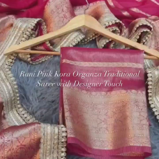 Woven in lustrous silk with intricate gold zari borders and floral motifs, this saree captures the grandeur of traditional Banarasi artistry.