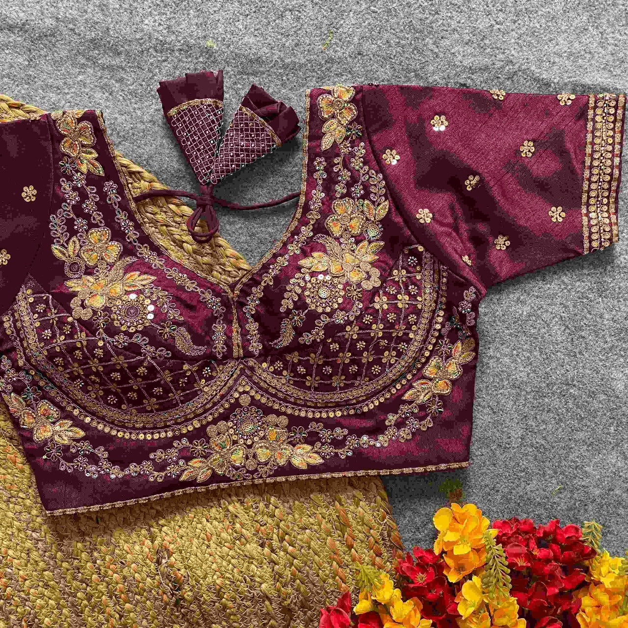Step into timeless elegance with this magenta raw silk blouse, richly embellished with intricate zari and resham embroidery. Featuring delicate floral motifs and sequin highlights, this piece is a statement in traditional craftsmanship. The scalloped neckline and hand-tied dori at the back add a refined touch to the blouse, making it perfect for festive occasions, weddings, or traditional gatherings.