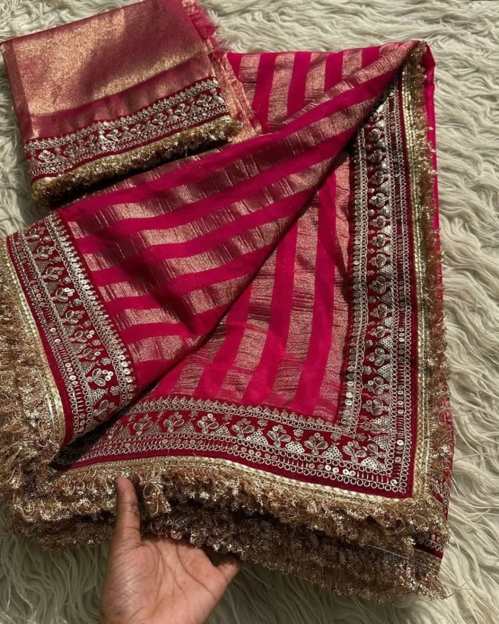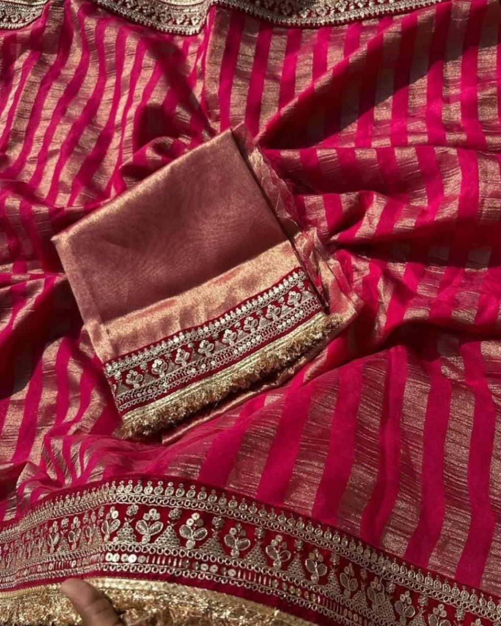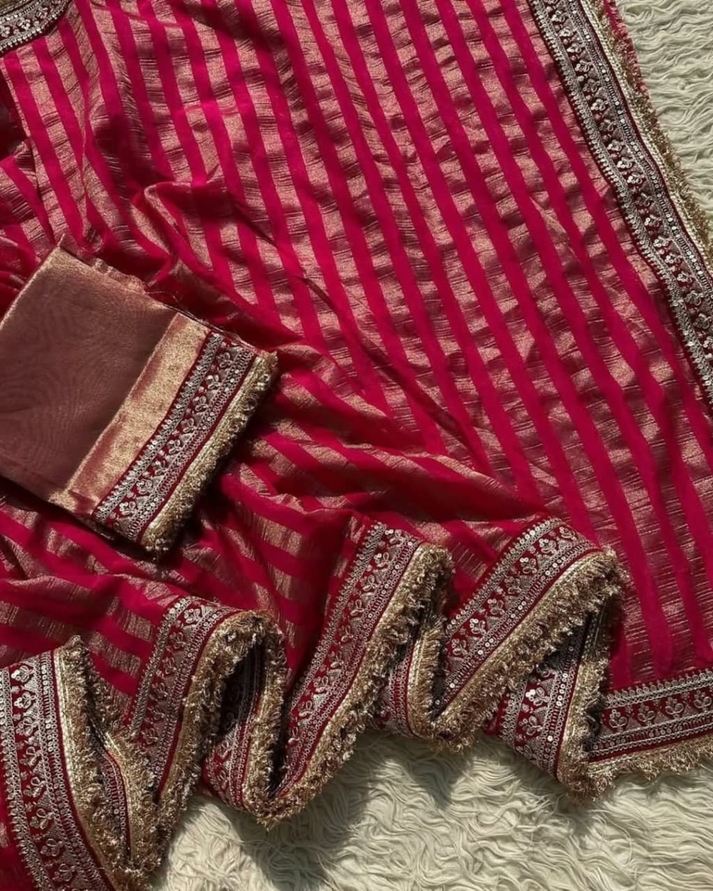 Riwayat Banarasi Organza Tissue Silk Saree – Premium Wine Red Saree with Lace Border