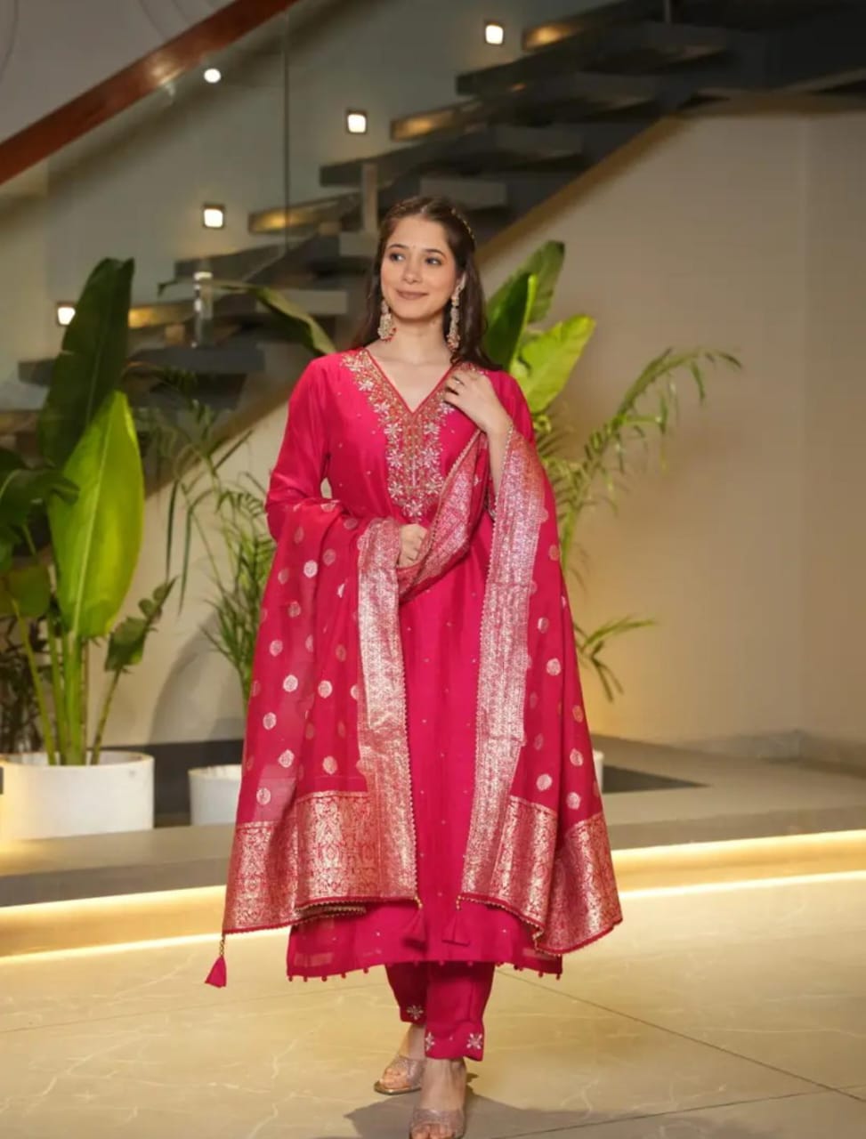Noor Handcrafted Dola Silk Suit Set in Crimson Rose