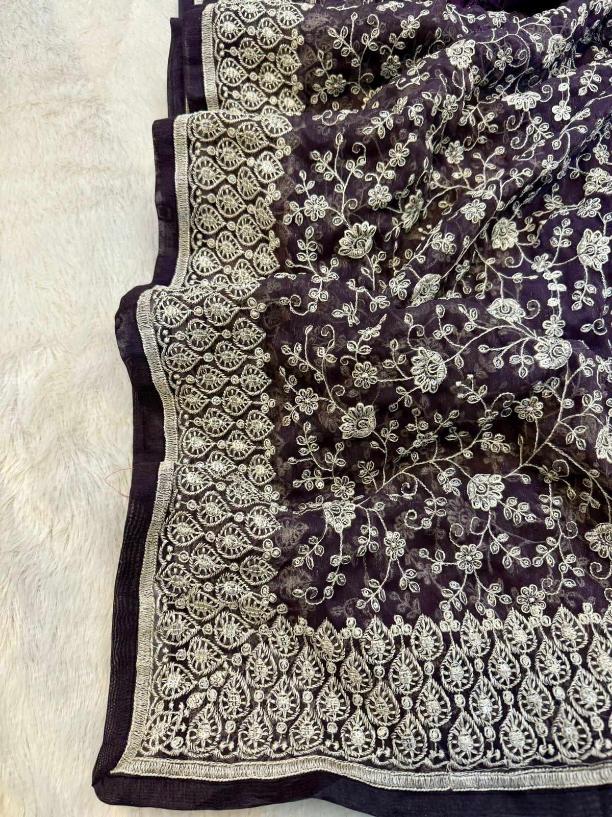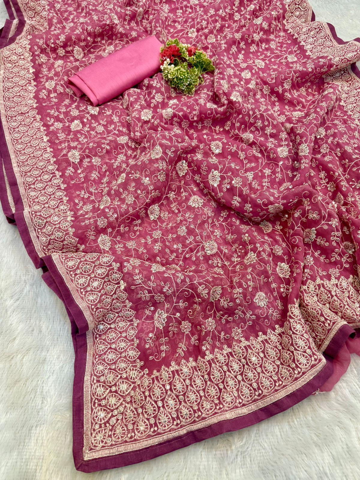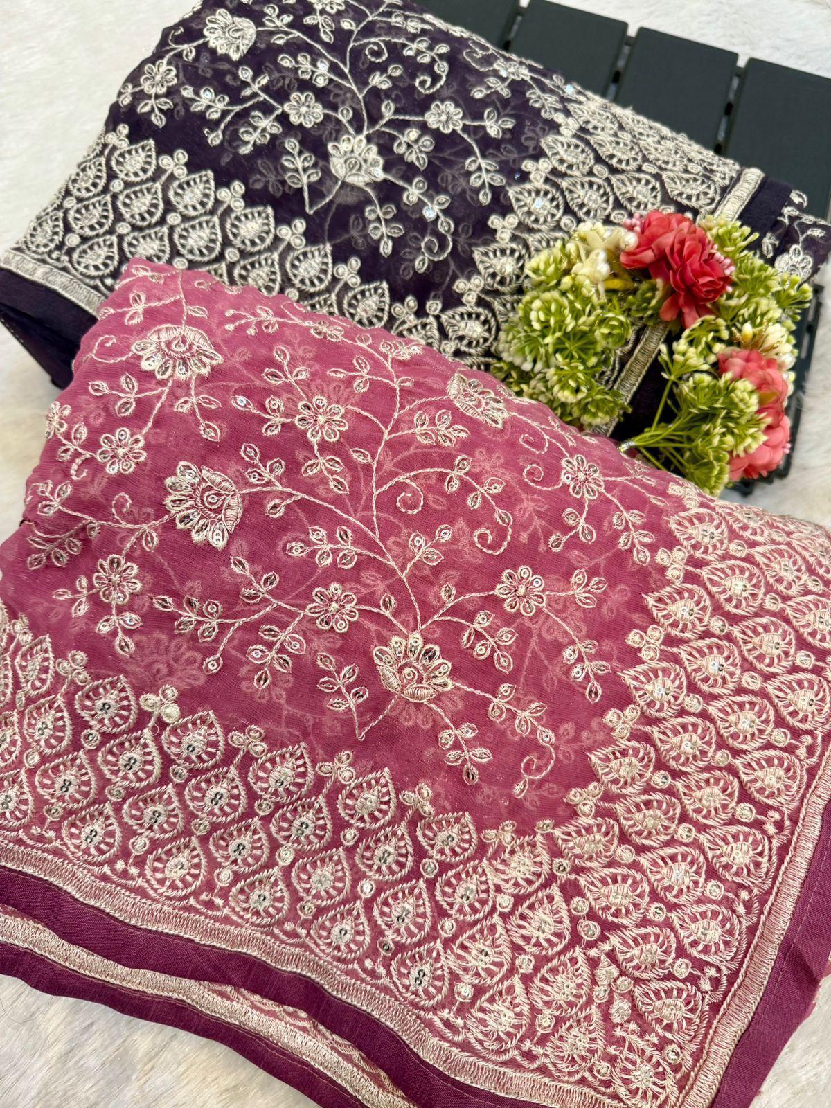 Whether you're choosing the soft blush pink or the cool silver-grey, this saree blends heritage embroidery with contemporary elegance.